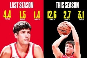 谢泼德本季场均12.6分&三分命中率47.8% 上赛季4.4分&三分33.8%