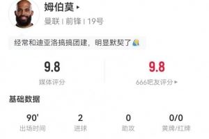 姆伯莫本场3射3正进2球+1失良机 5过人4成功 9对抗6成功 获9.8分