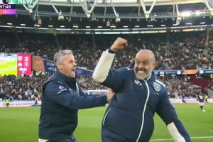 不容易!取得上任西汉姆联后首胜,努诺场边与教练组激动相拥